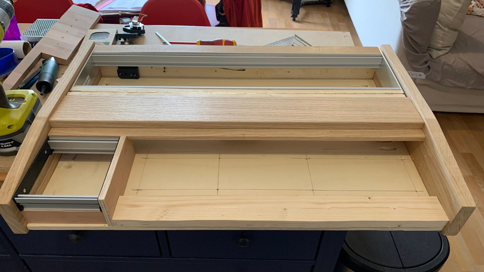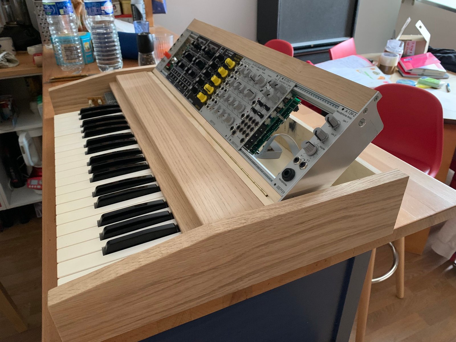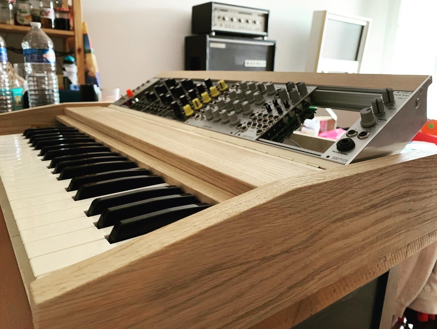 Le châssis en bois massif a été dessiné et fabriqué sur mesure, avec une attention particulière portée à l’ergonomie, à l’inclinaison du panneau modulaire et à la solidité pour un usage scénique. L’esthétique s’inspire des instruments vintage tout en affirmant une identité contemporaine.